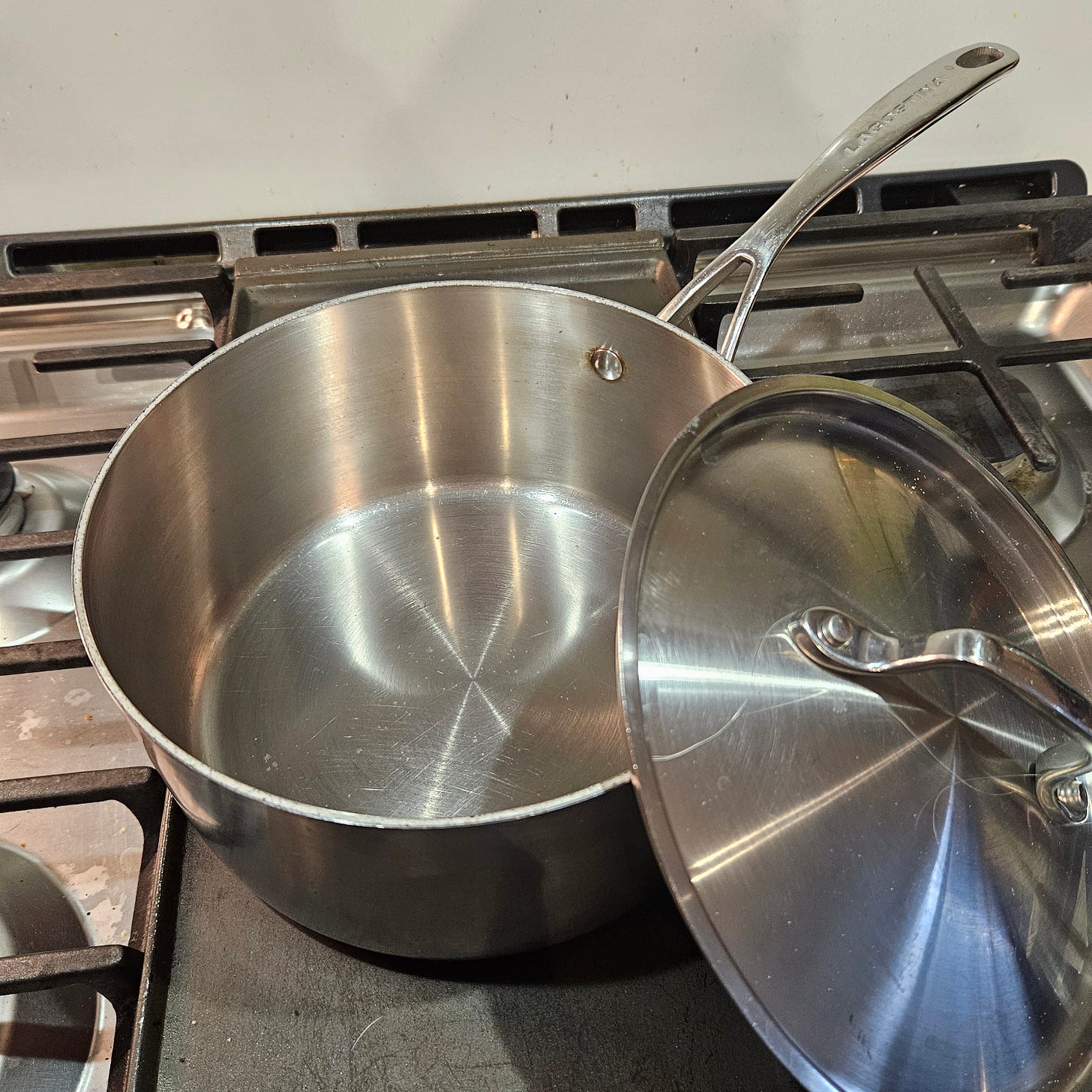 Handles & Lids: The maximum temperature of your pans will be dictated by the maximum temperature of the handles! If the handles on your pots and/or lids are made of plastic, you won’t be able to put the pan in the oven, and if you have a gas stove, it can melt if it gets too close to the flame. Another thing to be mindful of (and I wish I’d checked this when I bought mine 15 years ago) is the length and thickness of the handles: are you able to easily lift the pot or pan with one hand when it’s full? I find the handles on my pots to be a bit too long and thin, so I have to use a pot holder or oven mitt and grab them closer to the pot for stability. Some larger pots will often have a “grab handle” on the opposite side to help with this. Also, make sure the handles are securely attached with rivets, rather than screws. These details are what distinguish the quality of a piece of cookware.