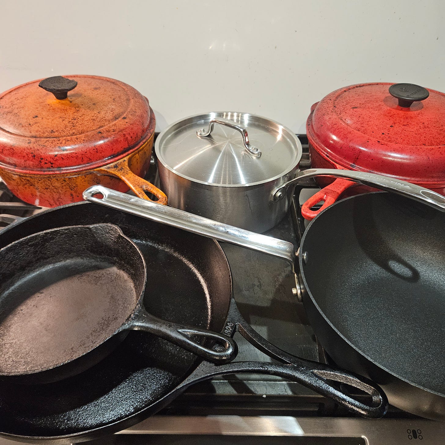 Stainless steel: Very popular, economical, doesn’t heat up particularly well, can be a pain to clean - especially when things get baked onto the surface. Food can stick if you don’t heat it up well enough beforehand. There are lots of cool videos online that show that a small amount of water should bead up and dance around the surface of the pan, letting you know the pan is ready to cook on. The adage “Hot pan, cold oil: food won’t stick” applies here. Most high-end cookware will be made of stainless steel on the outside and will have a core of aluminum, so you get the best of both worlds in one pan. Depending on the amount of nickel used in manufacturing, some stainless steel can’t be used on induction cooktops. Best way to check is whether a magnet will solidly stick to the bottom of the pan.