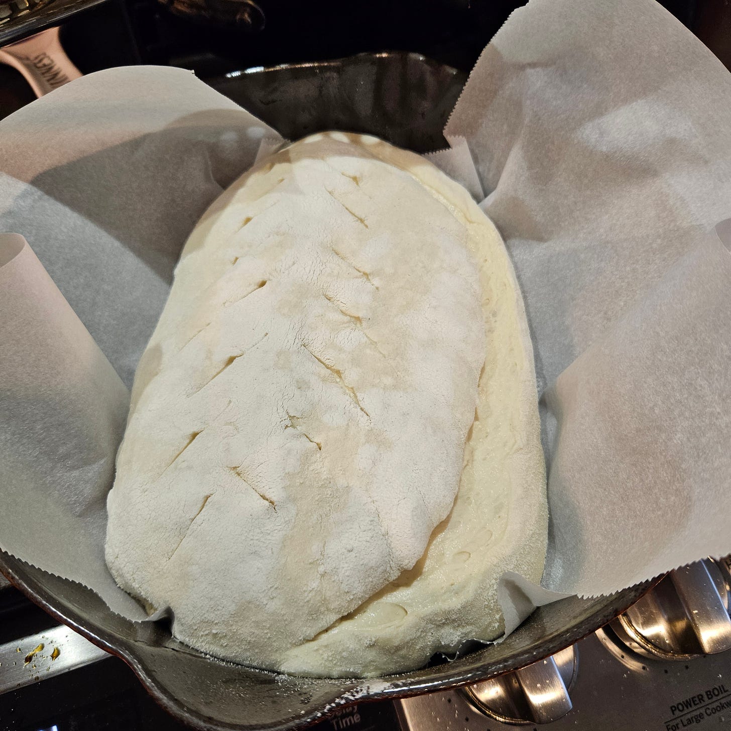 It’s now early-mid afternoon on Saturday. Put your Dutch oven and lid into your oven and pre-heat it to 500F (or whatever the top temperature your oven will go to.) It takes at least 30 minutes to get up to temperature.