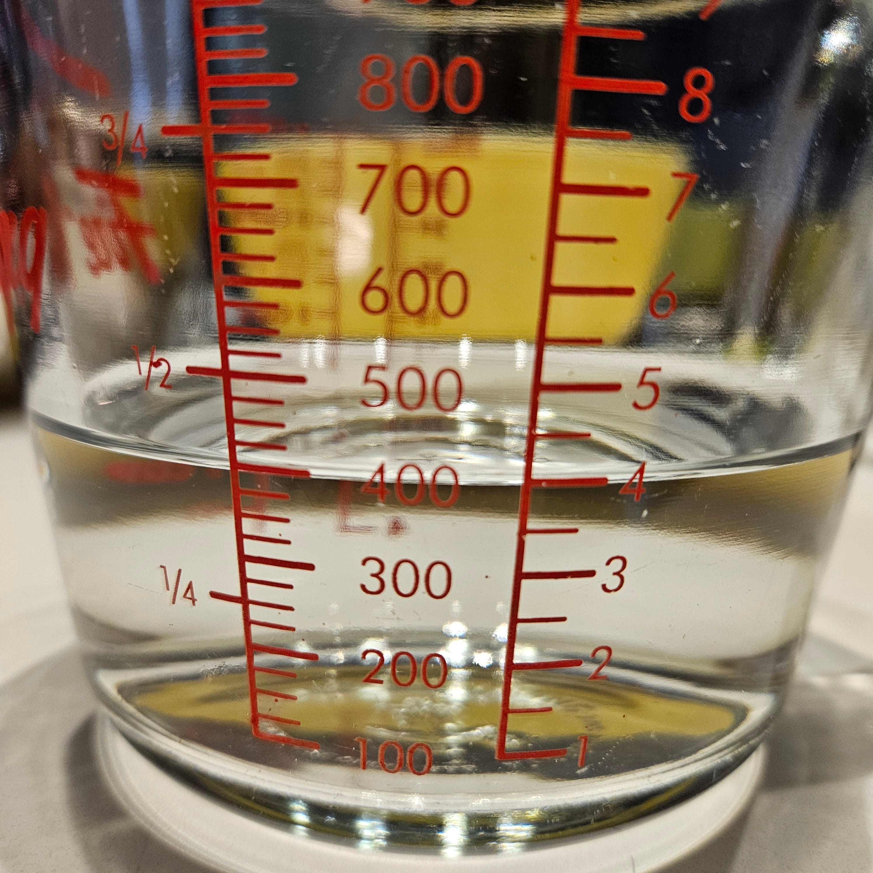 Put a large (1L) measuring cup (or bowl) on your scale and measure out 395g of room temperature water