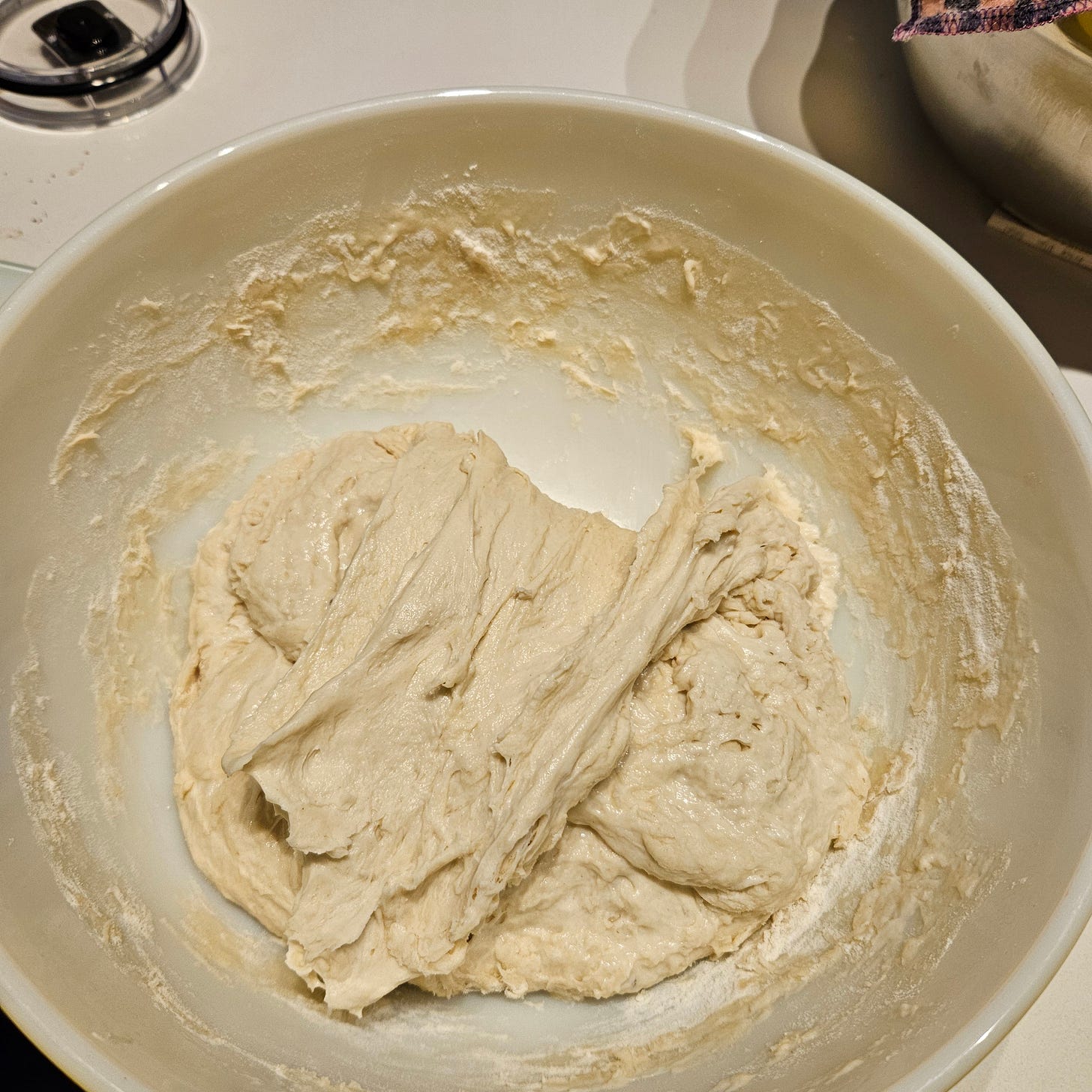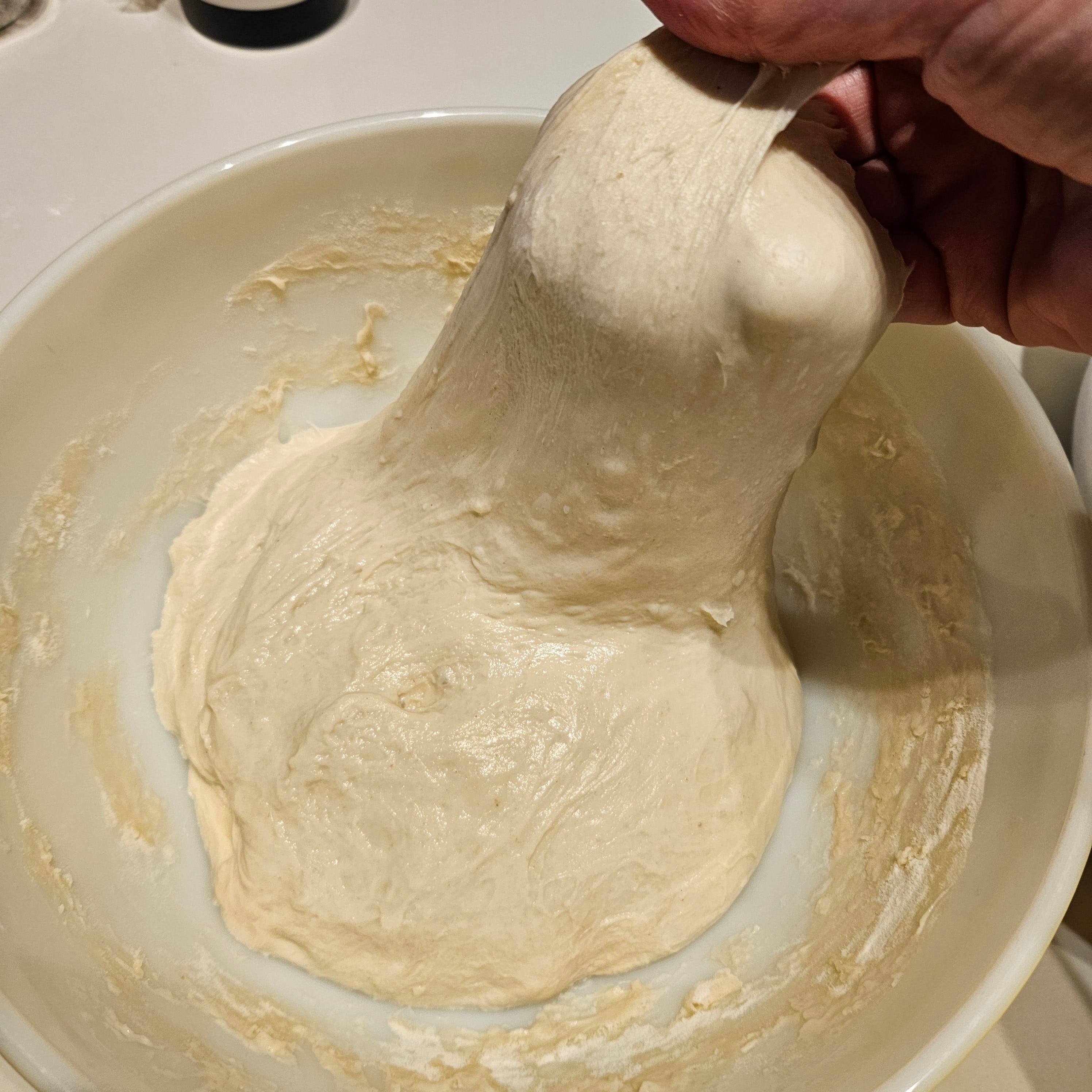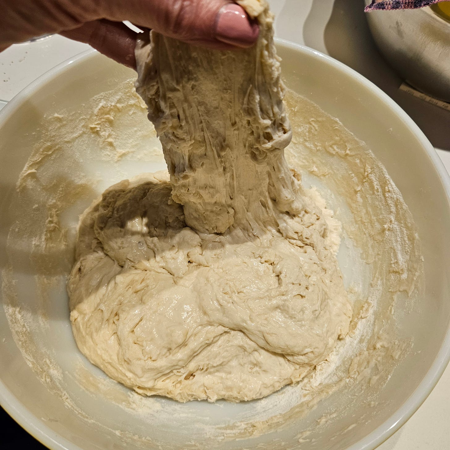 Turn the bowl 1/4 turn, pick up another section and stretch/fold that. Repeat this 3-4 times. Cover the dough and set your timer for another 60 minutes.