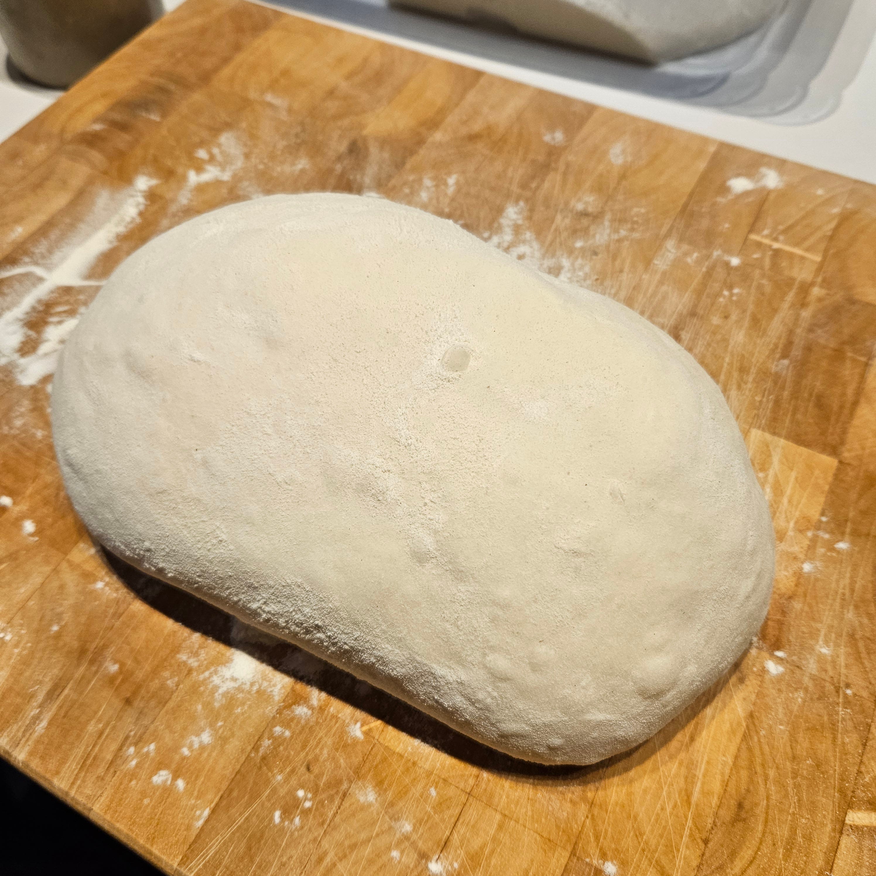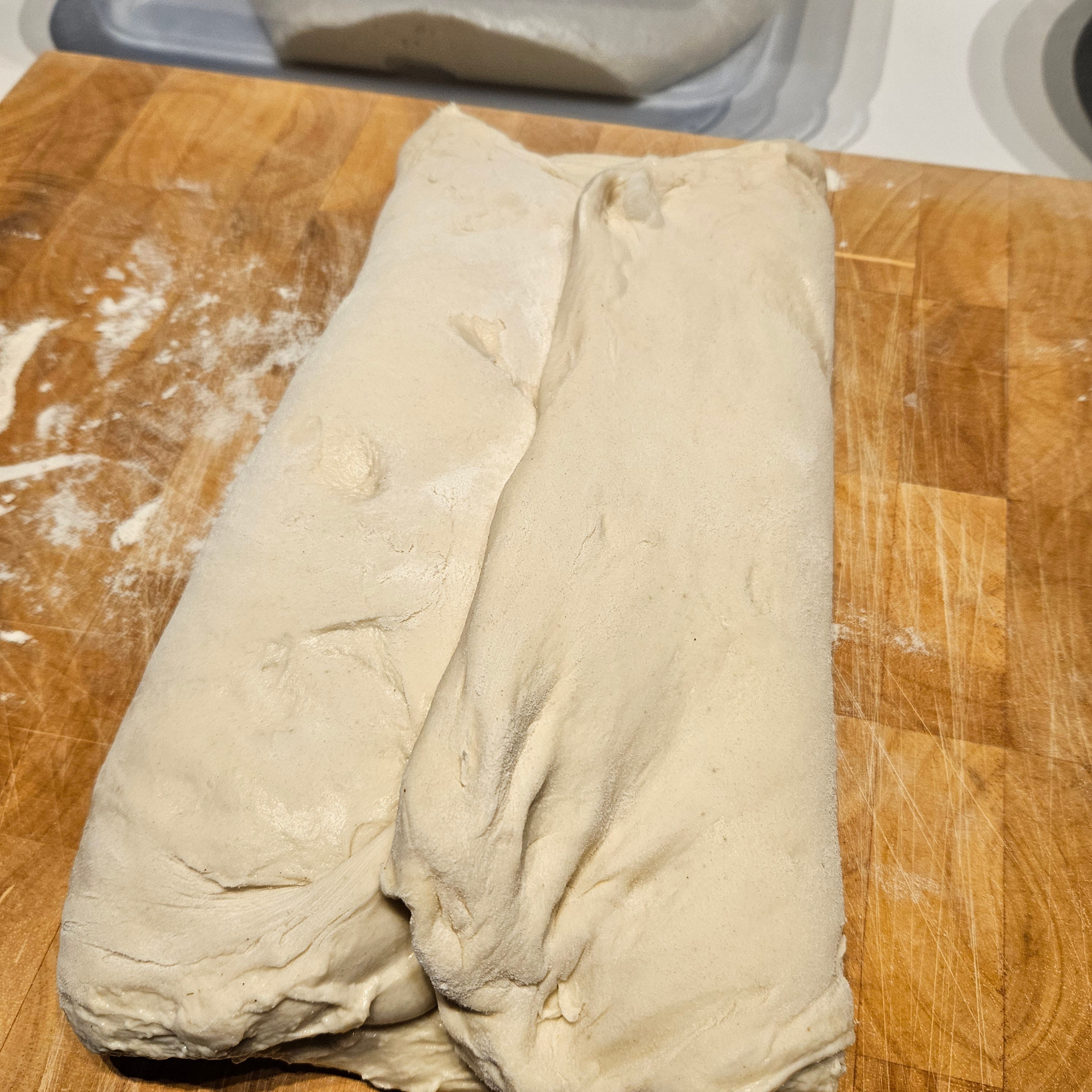 Saturday, late morning: turn the dough out onto a lightly floured surface and stretch it out again.