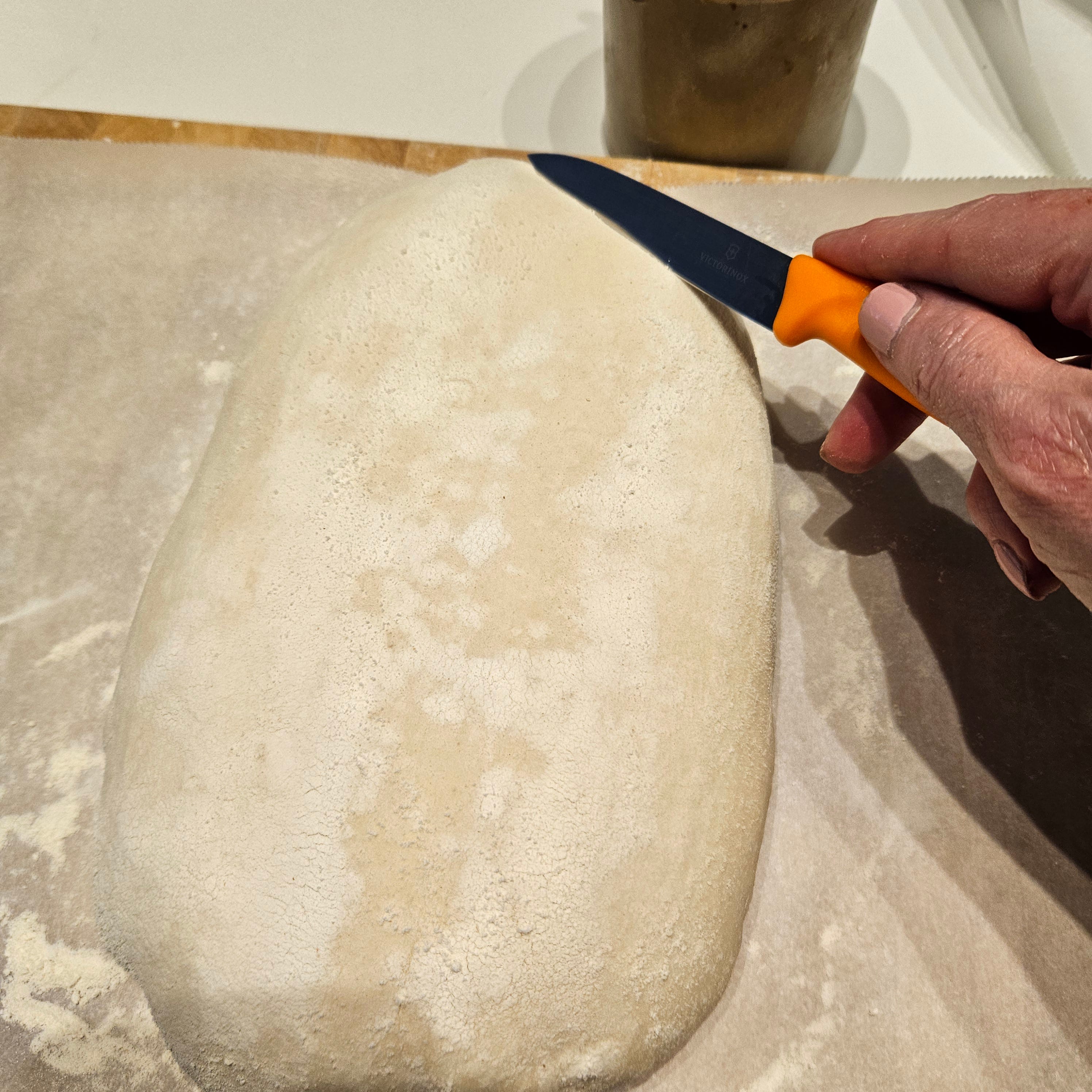 Next, you have to score the loaf. The reason we do this is because as it bakes, steam will build up inside the loaf and unless it has somewhere to escape, it will break and crack at random places, making it look a bit messy.