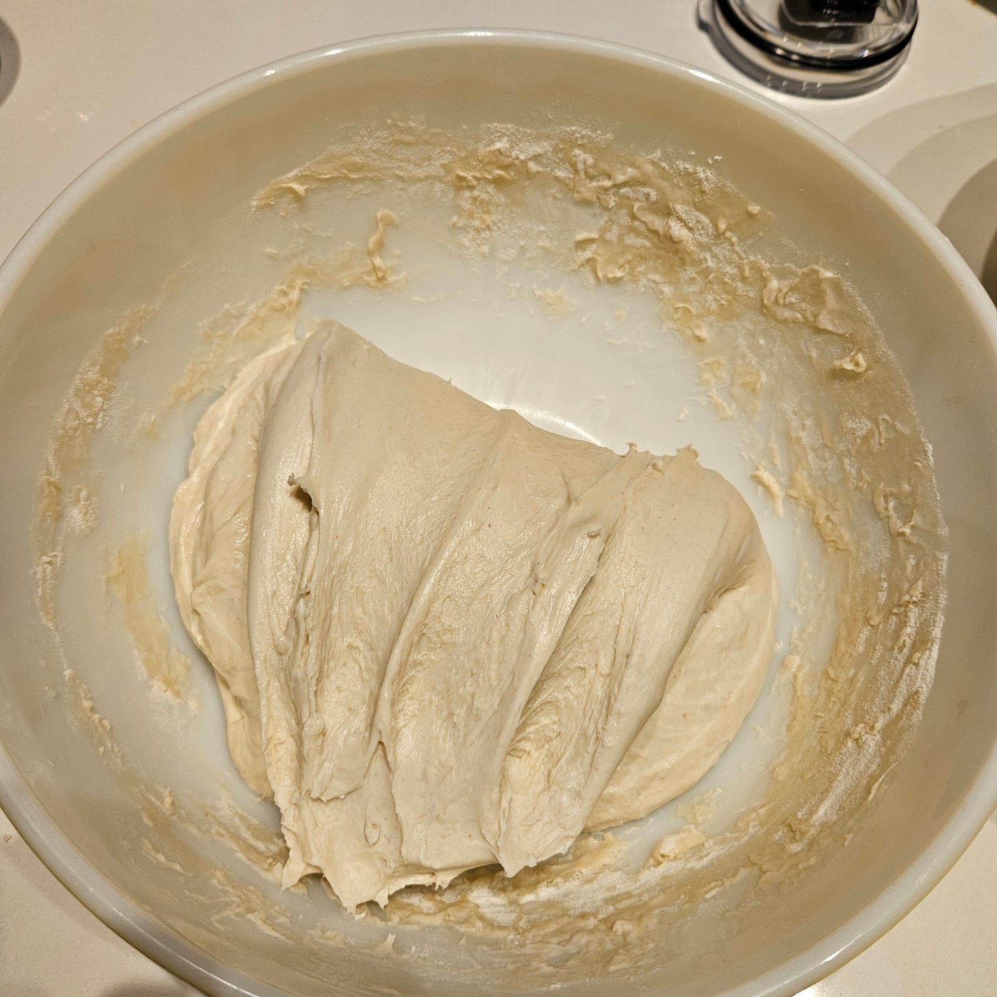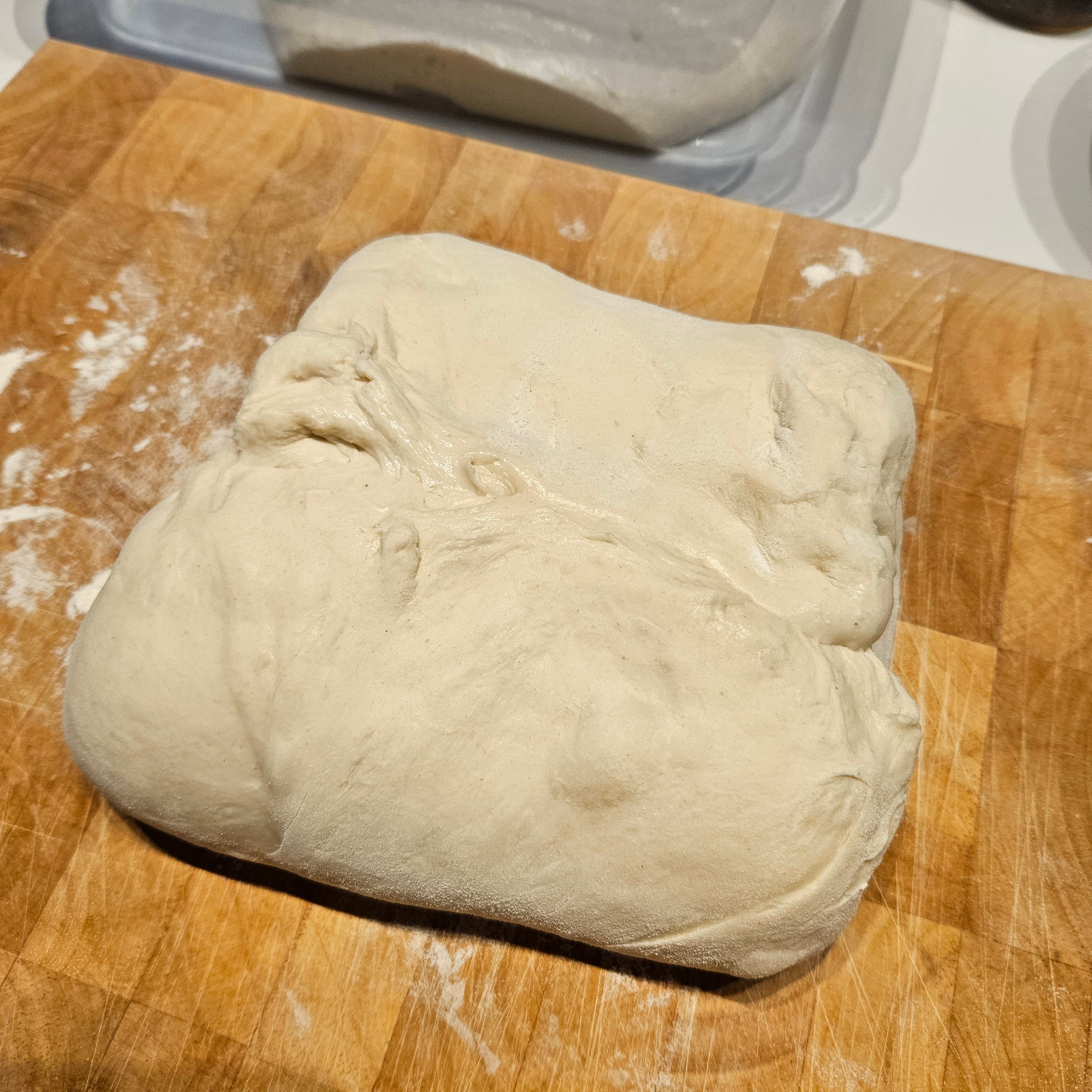 You’ll repeat this process two more times (for a total of 3 sets of stretch/fold over a 3-hour period.) Each time you let the dough rest and come back to it, you’ll see that it has changed and become more smooth and stretchy. This image is from the third and final set of stretch & fold.