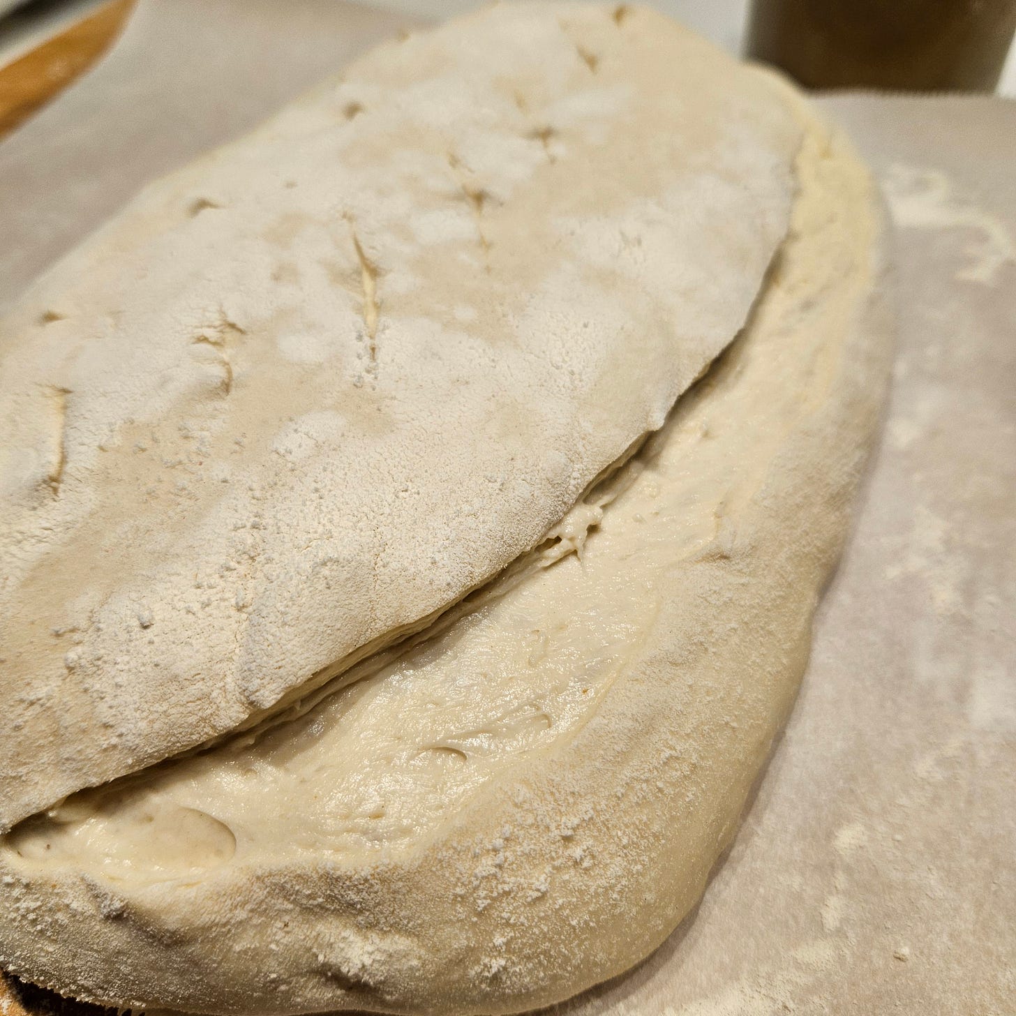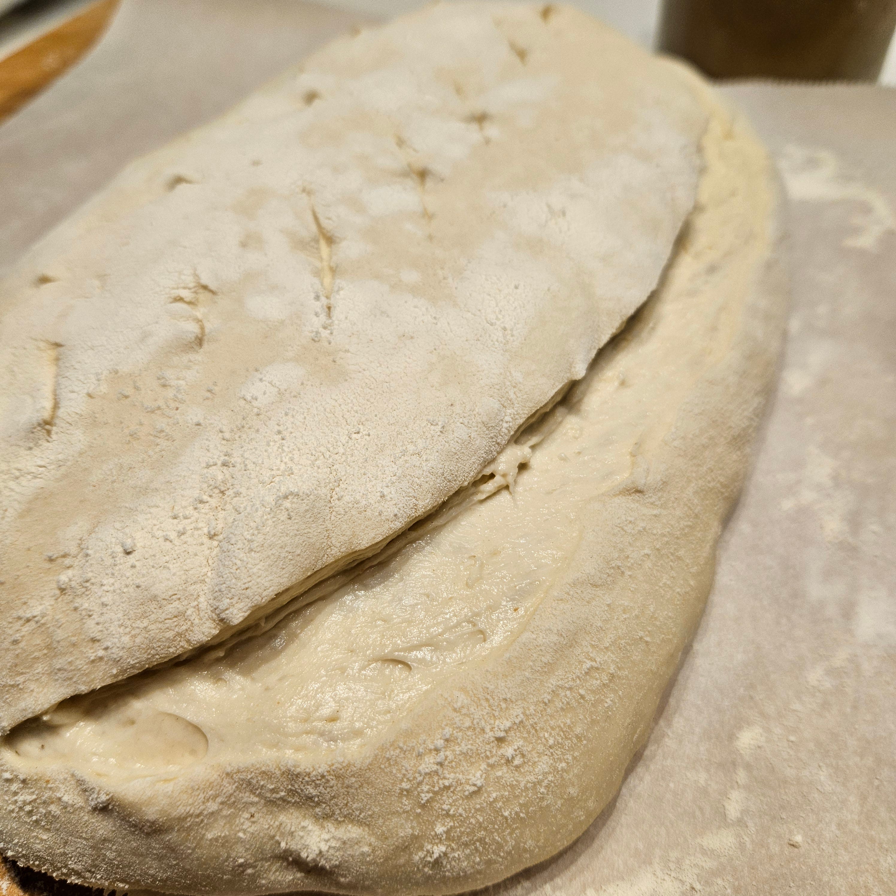 At this point, it kind of looks and feels like very wet pizza dough. Make sure not to put any flour on the sticky side as we are going to fold this over and we actually want it to stick to itself.