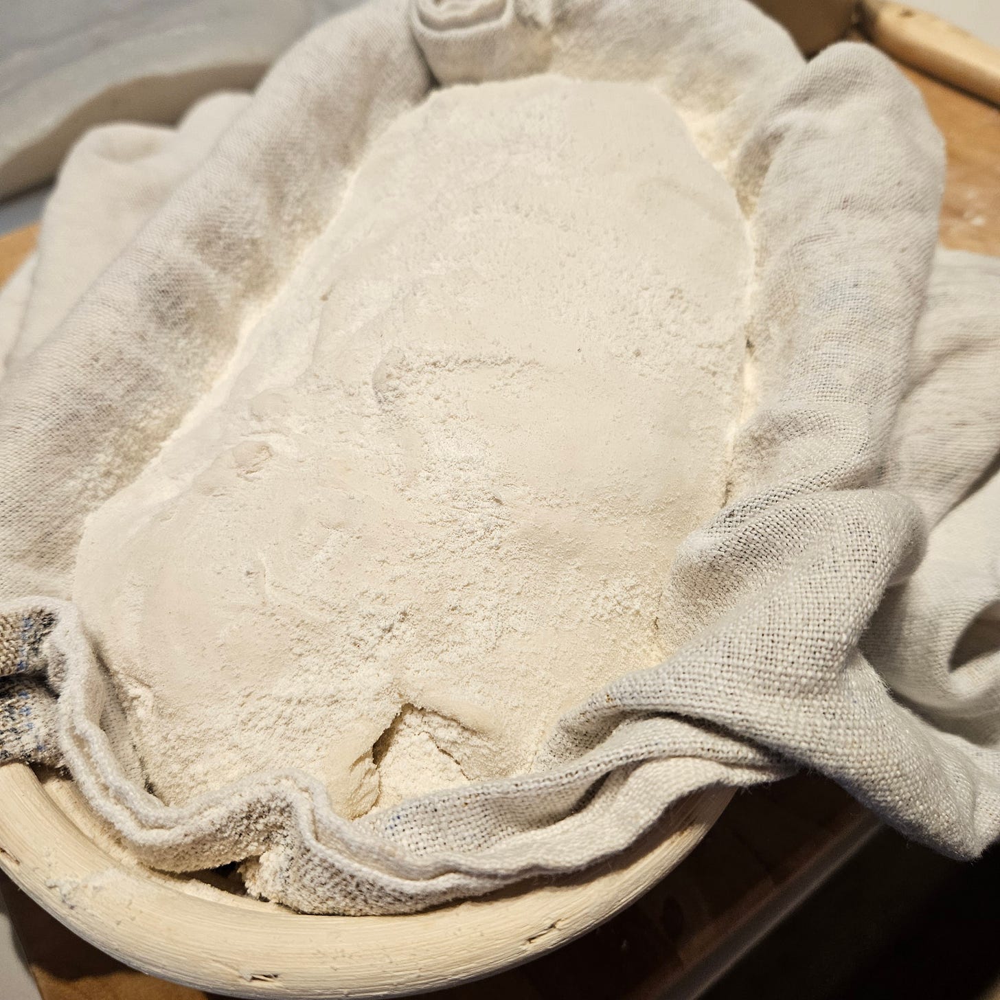 Place the loaf, bottom (or, seam) side up in your proofing basket, lined with a clean and well-floured kitchen towel. The one I use is linen, but don’t use terry-cloth, make sure the surface is smooth.